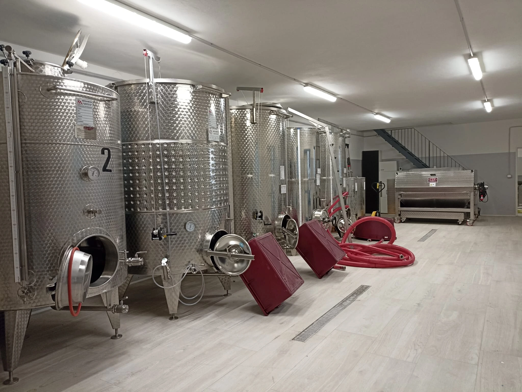 Op de dag van het oogsten worden de druiven gelijk verwerkt. In de cantina worden de druiven ontsteeld en gekneusd.